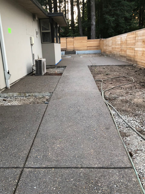 SMV Concrete designed and installed this custom concrete patio, transforming a sloped yard area into a beautiful, functional outdoor living space. This project required a blend of technical expertise to manage the challenging grade changes and artistic skill to deliver a high-end decorative finish.